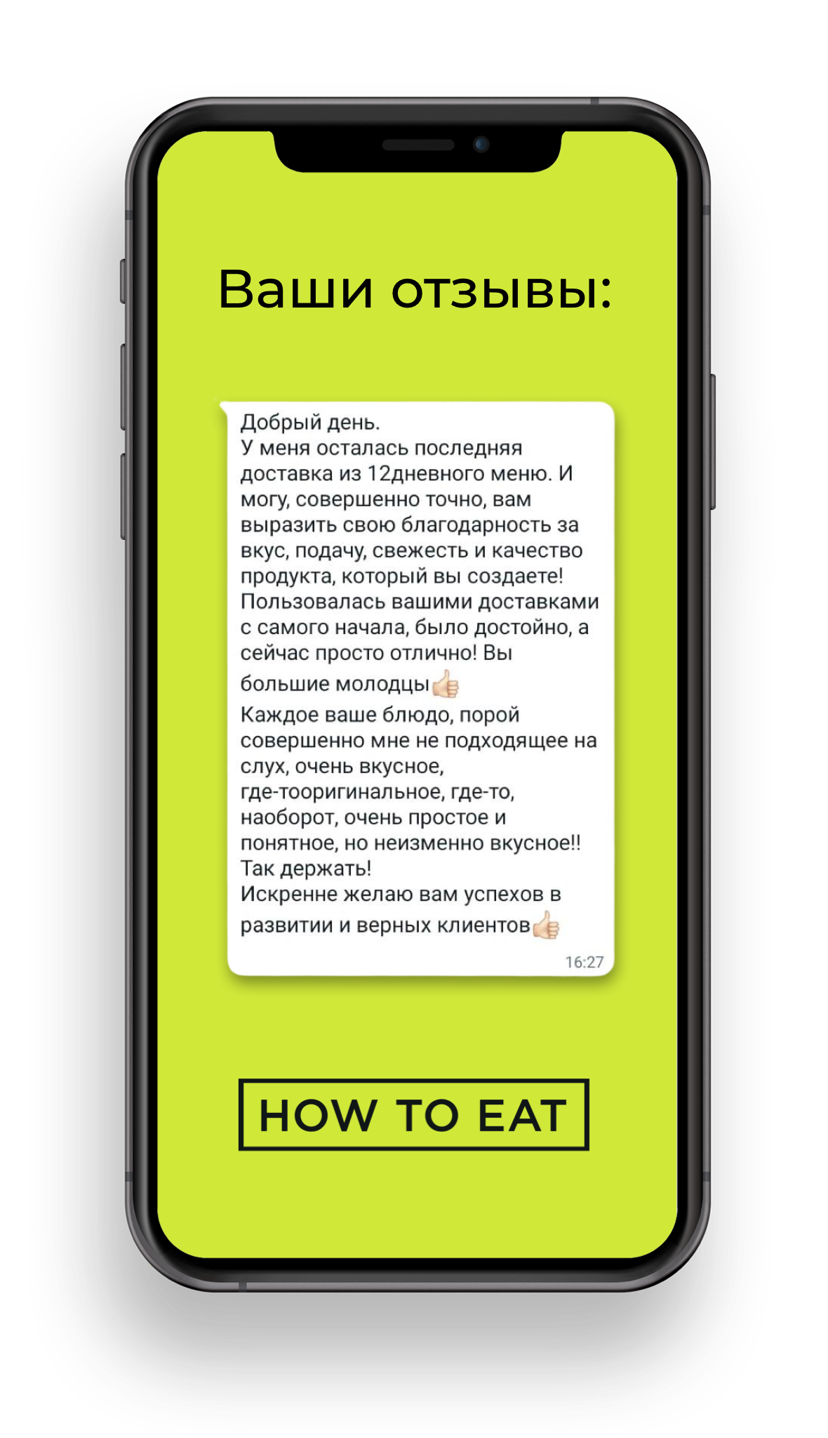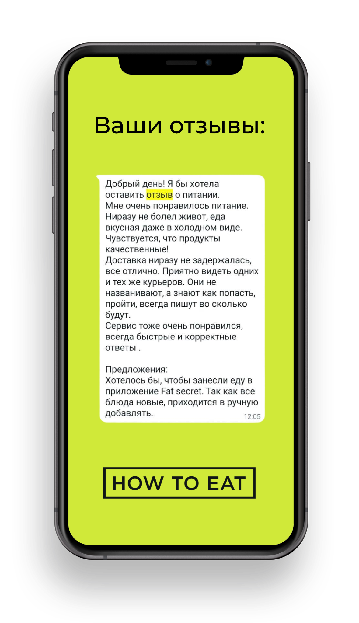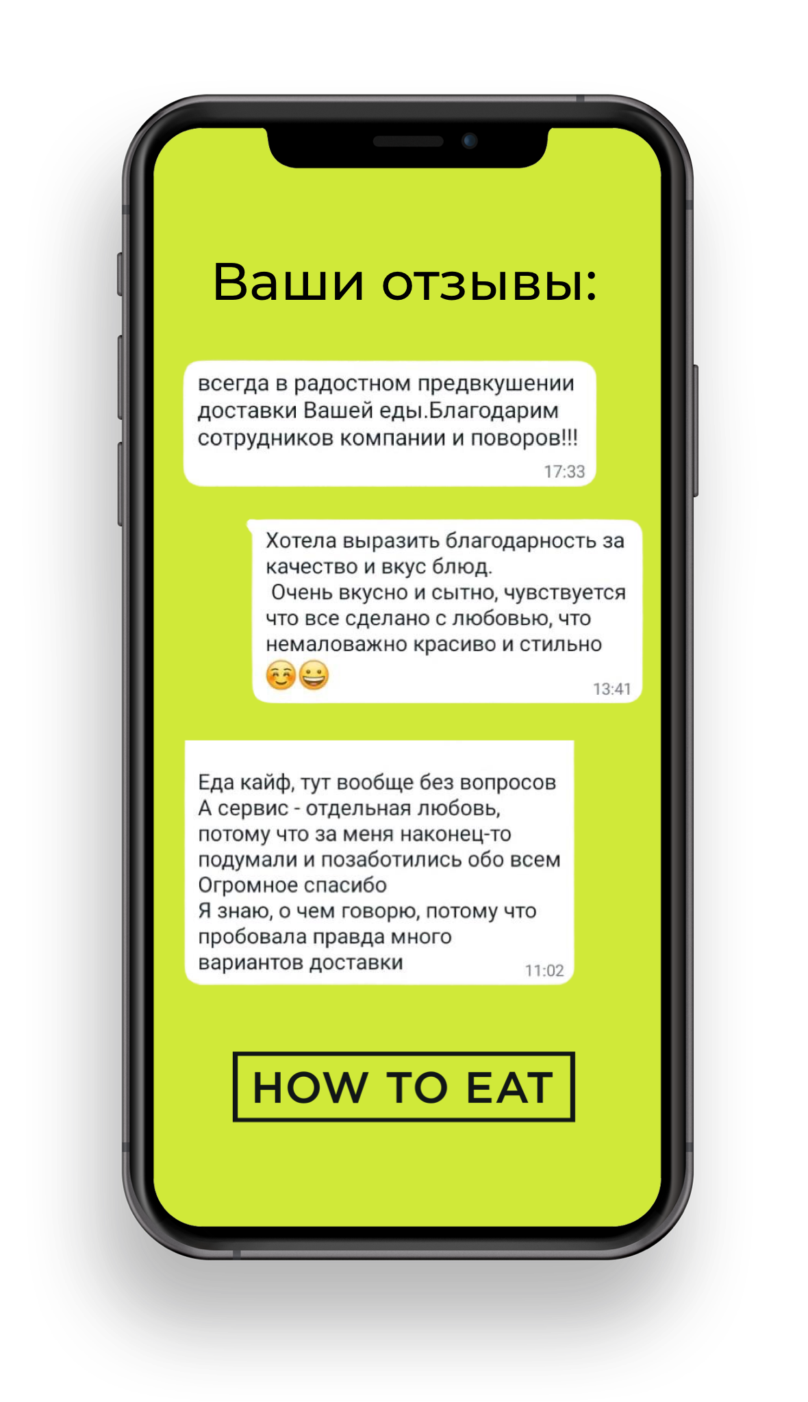 Команда профессиональных поваров How to Eat готовит всю еду в собственном цеху на фабрике авиационного и больничного питания. В связи с таким специфическим соседством само производство постоянно подвергается проверкам Роспотребнадзора, а также контролируется Министерством здравоохранения. Именно поэтому, заказывая еду в How to Eat, можно быть уверенным в качестве блюд.